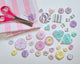 5. Tee seuraavaksi korvalehteä vasten tulevat koruosat, joihin korvakorupiikit voidaan kiinnittää. Värin voit valita mielesi mukaan. Kaulitse valitsemastasi Fimo-massasta levyt ja paina niistä haluamasi muotoinen korunosa. Pyöreä on hyvä perusmuoto.