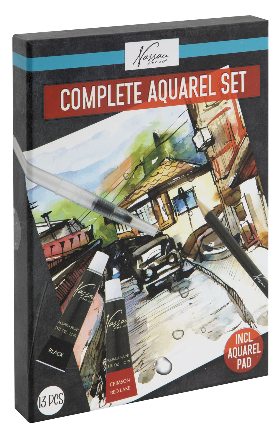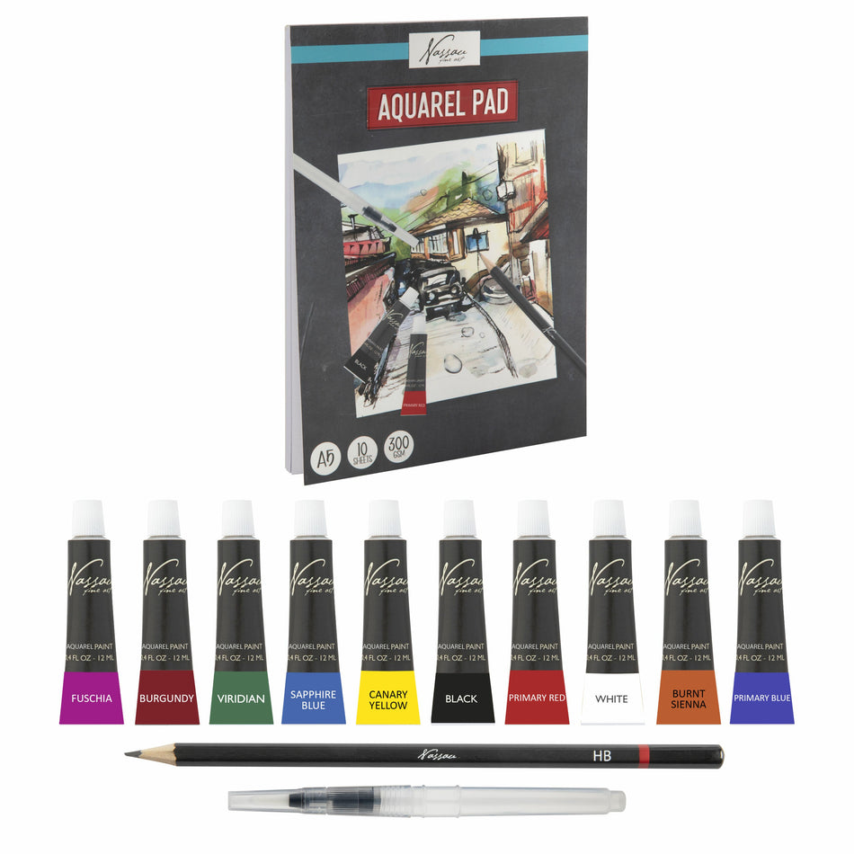 Ihana ja kompakti pakkaus akvarellimaalaamiseen! Sopii hyvin aloitteleville sekä kokeilunhaluisille taiteilijoille, sillä pakkauksessa on mukana kaikki perustarvikkeet: 10 väriä, HB lyijykynä, sivellin sekä A5-kokoinen akvarellilehtiö.