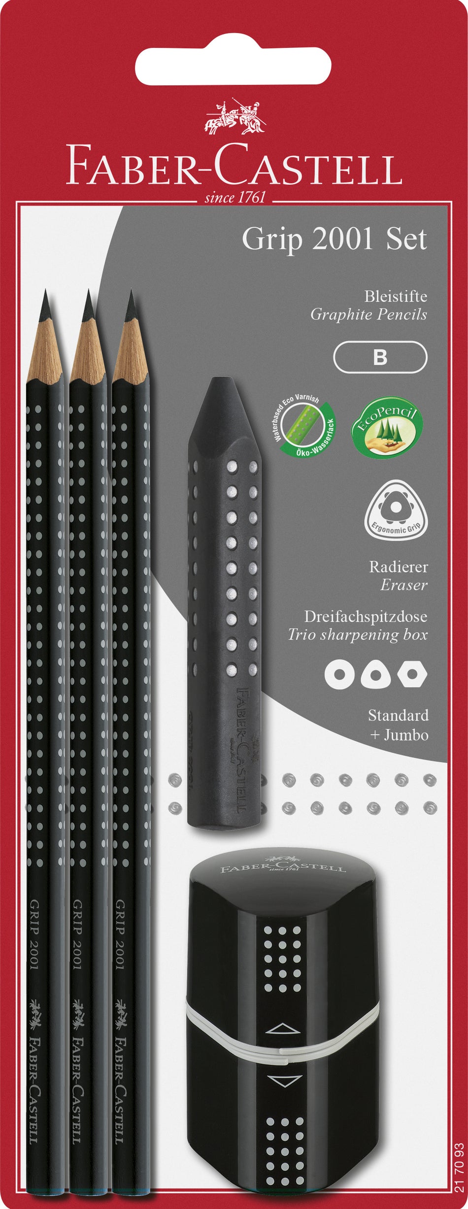 Faber Castellin Grip 2001 kirjoitusetti sisältää 3 lyijykynää B kovuudella, pyyhekumin ja teroittimen.
