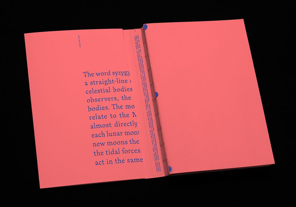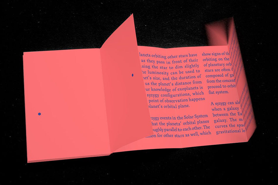 Inka Bell's Syzygy finds its starting point in the astronomic phenomenon of the same name, where three or more celestial bodies align in space. Bell's minimalist abstract shapes slowly drift through the space of the book's pages, floating towards the possibility of alignment. The book includes a short essay on the phenomenon and its significance on our understanding of the universe by the astronomer Pertti Rautiainen.