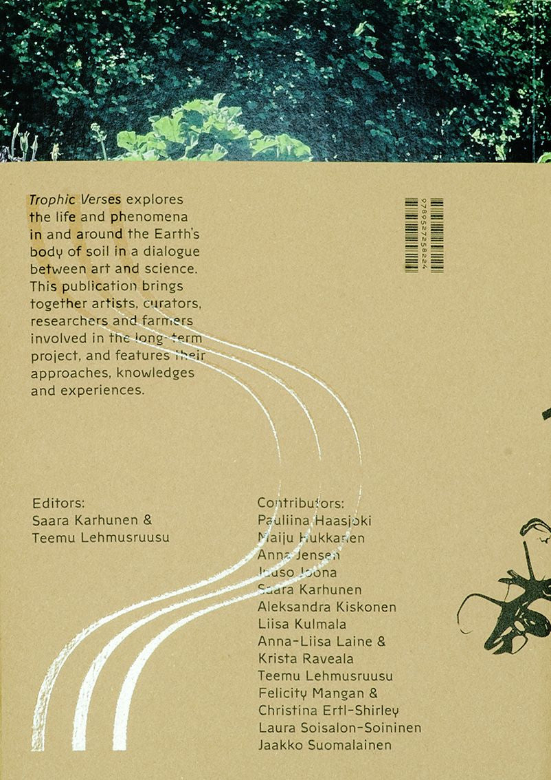 Monivuotisessa Trophic Verses — Säkeitä ravintoketjulta -hankkeessa on tarkasteltu maaperän ilmiöitä taiteen keinoin vuoropuhelussa tieteen kanssa. Kirja avaa monialaisen hankkeen puitteissa syntynyttä keskustelua, ajattelua, tietoa sekä kuratoriaalisia ja taiteellisia prosesseja tekstein ja kuvin. Trophic Verses kokoaa yhteen taiteilijoita, kuraattoreita, tutkijoita ja maanviljelijöitä sekä näiden erilaisia tapoja hahmottaa aihetta. Muodoltaan kirja heijastaa laajemman hankkeen luonnetta: se on kenttämuistiinpanojen ja uteliaan keskustelutoverin kaltainen teos.