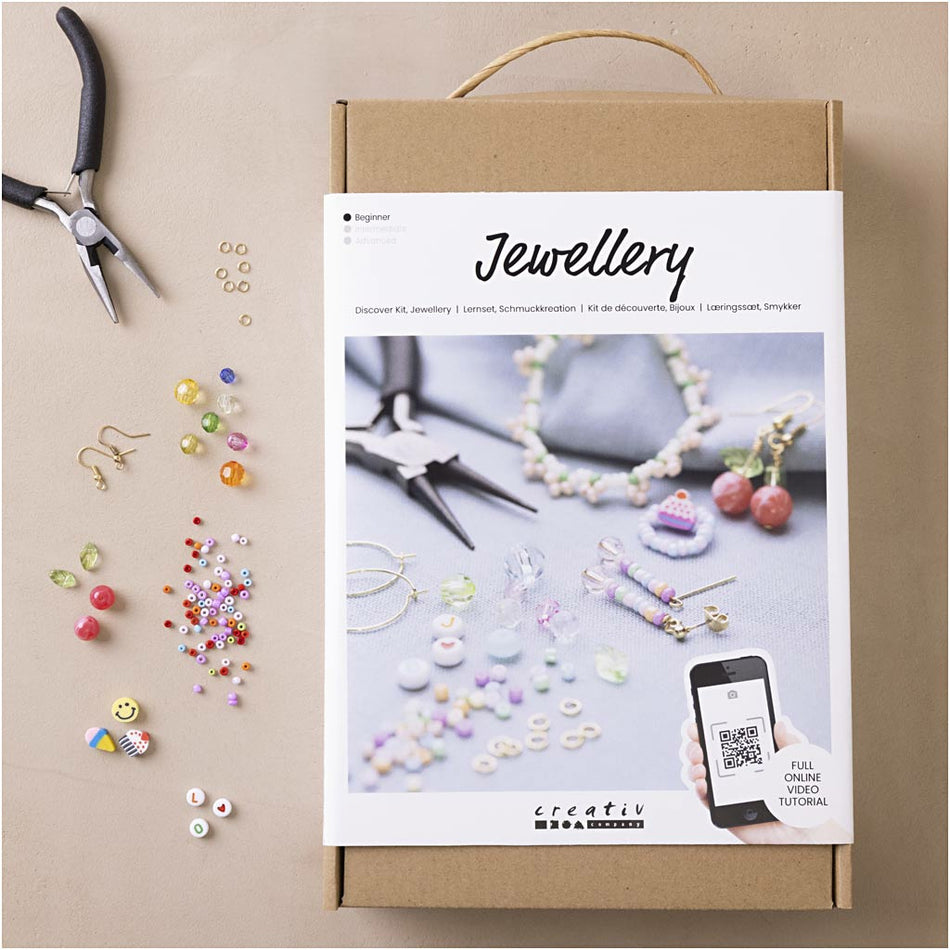Jos haluat oppia tekemään koruja itse, tämä aloituspaketti sopii sinulle täydellisesti. Opi tekemään koruja tällä Aloittelijan Askartelusetti , joka sisältää kaiken tarvittavan, jotta pääset alkuun. Skannaa QR-koodi ja tutustu oppimismaailmaamme, joka on täynnä ohjevideoita. Opit korujen tekemisen erilaisia peruselementtejä ja tekniikoita. Lopulta sinulla on neljä paria korvakoruja, 20–25 helmirannekoruja, sormuspohjia tai kaulakoruja kuminauhassa.