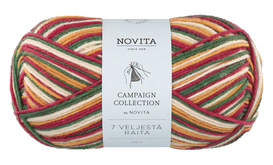 Novita 7 Veljestä Raita -langasta saat tasaraitaiset villasukat. Puikkosuositus 4, sukkiin 3.5. Konepesu 40 asteessa. 100 g:n kerässä 200 m lankaa. Avainlipputuote. Lue lisää