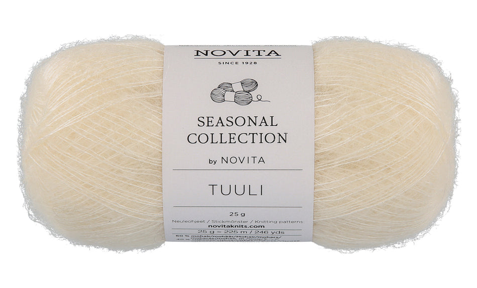 Novita Tuuli -lanka sisältää 60% mohairia, 40% viskoosia. Puikkosuositus 3.5. 25g = 225m. Käsinpesu. Oeko-tex® STANDARD 100 -tuoteturvallisuusmerkki. Lue lisää