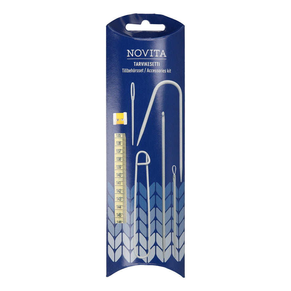 Neulojalle ja virkkaajalle Novitan näppärä Tarvikesetti! Setti sisältää 7 kpl tarpeellisia apuvälineitä; mittanauhan, viimeistelyneulan, apuvälineen langan pujottamiseen neulansilmään, puikkokoukun, silmukanpidikkeen, kerroslaskimen ja apupuikon esim. palmikon neulomiseen. Lue lisää
