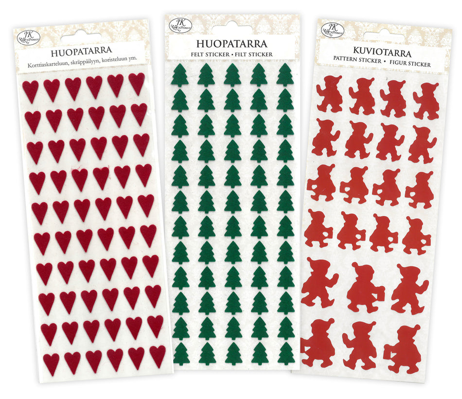 Tarrat askarteluun ja koristeluun. Pakkaus sisältää kolme arkkia erilaisia tarroja. Arkin koko on n. 23cm x 10cm.