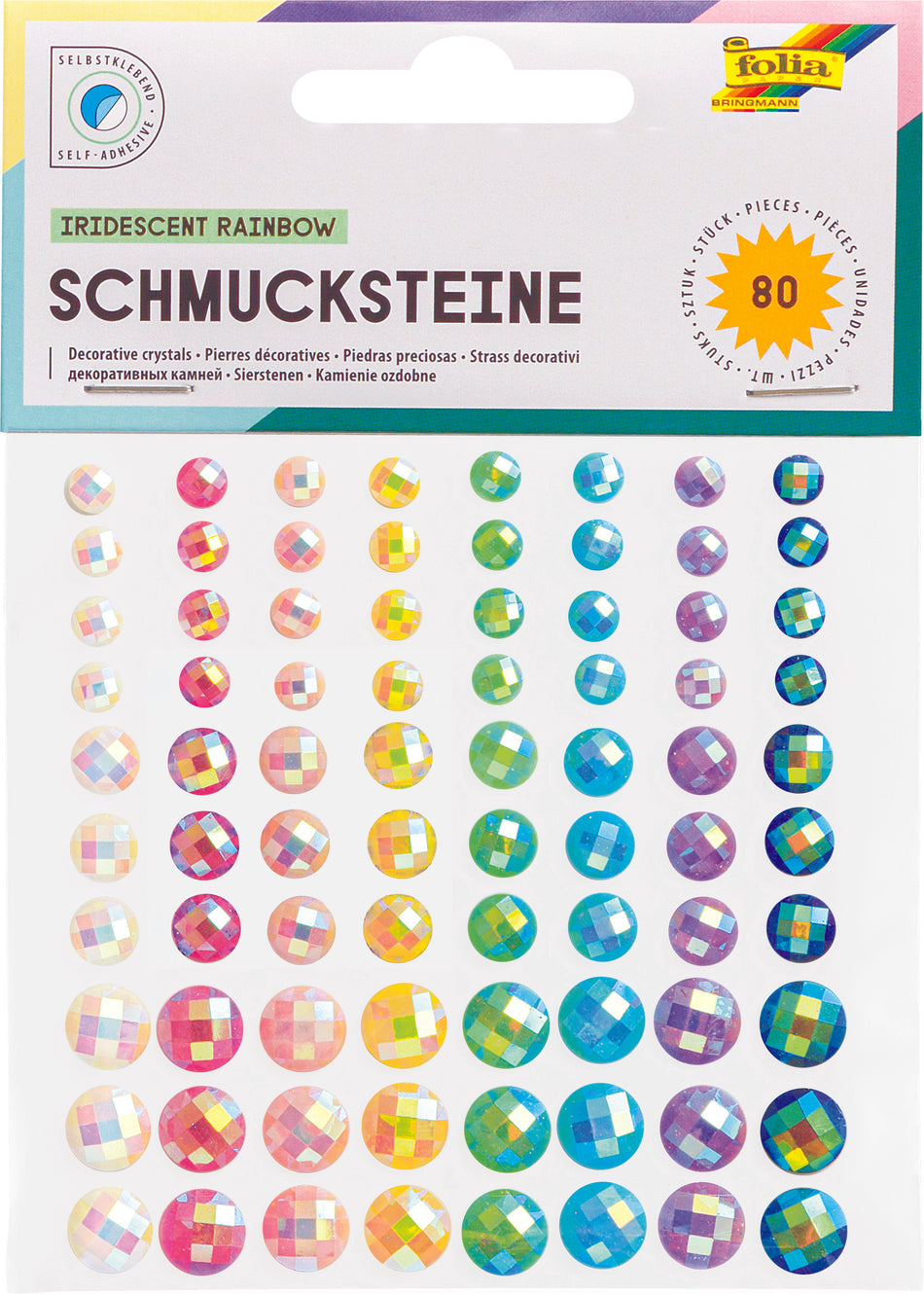 Folian timanttitarra-arkissa on 3 erikokoista hohtavaa timanttitarraa 8 eri sateenkaaren sävyssä.