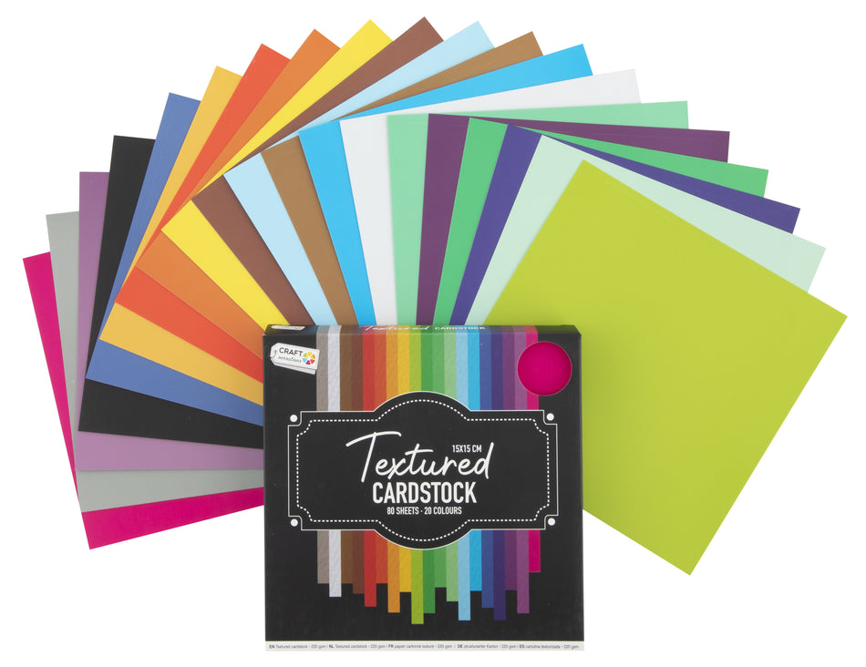 Pakkauksessa 80 arkkia 15x15cm värillistä kartonkia teksturoidulla pinnalla Lue lisää