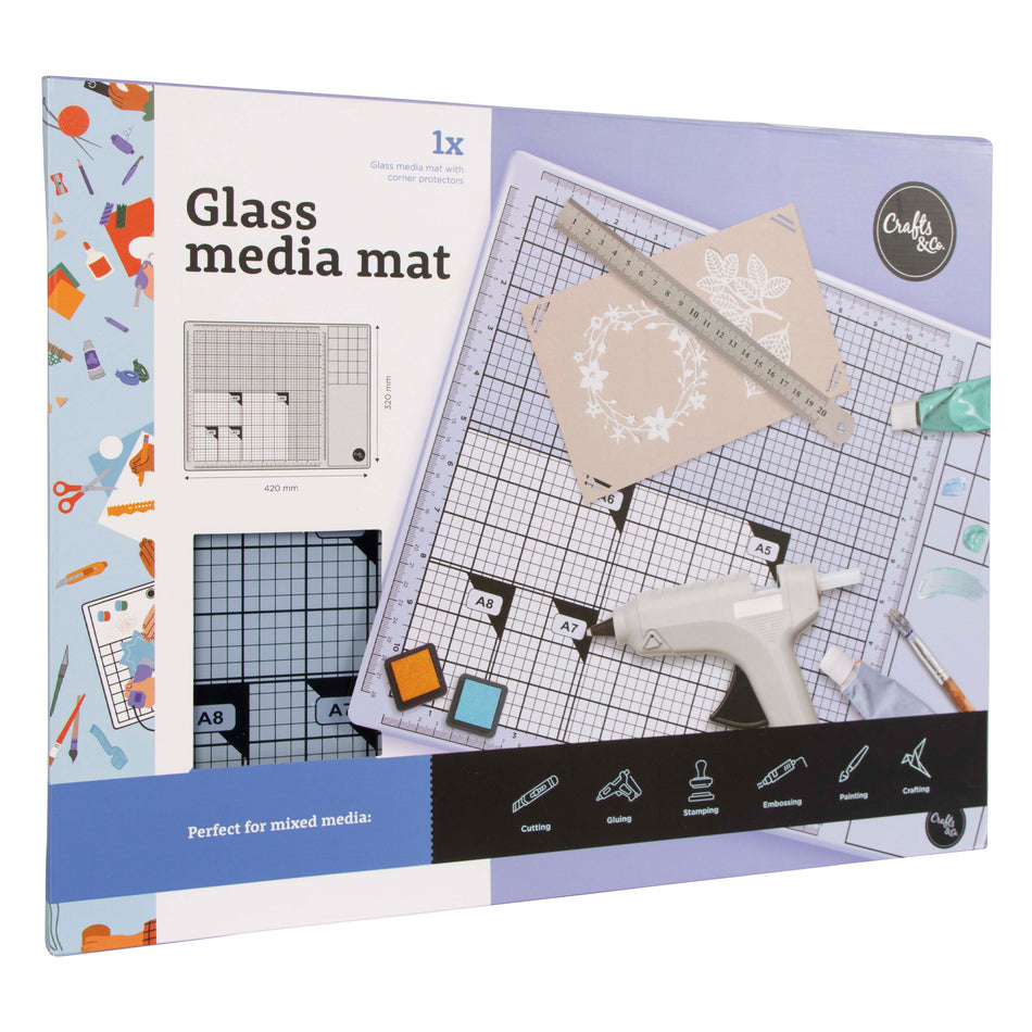 Lasinen askartelu-ja leikkuualusta moneen askarteluun; Leikkaamiseen, liimaamiseen, leimaamiseen, kuviointiin, maalaamiseen ja askarteluun. Helppo pitää puhtaana, 5mm paksua karkaistua lasia, liukuestenastat pohjassa, erilaisia mitta-asteikkoja, cm ja tuumakoot. Vakiokorttikoot A8-A5 merkittynä.