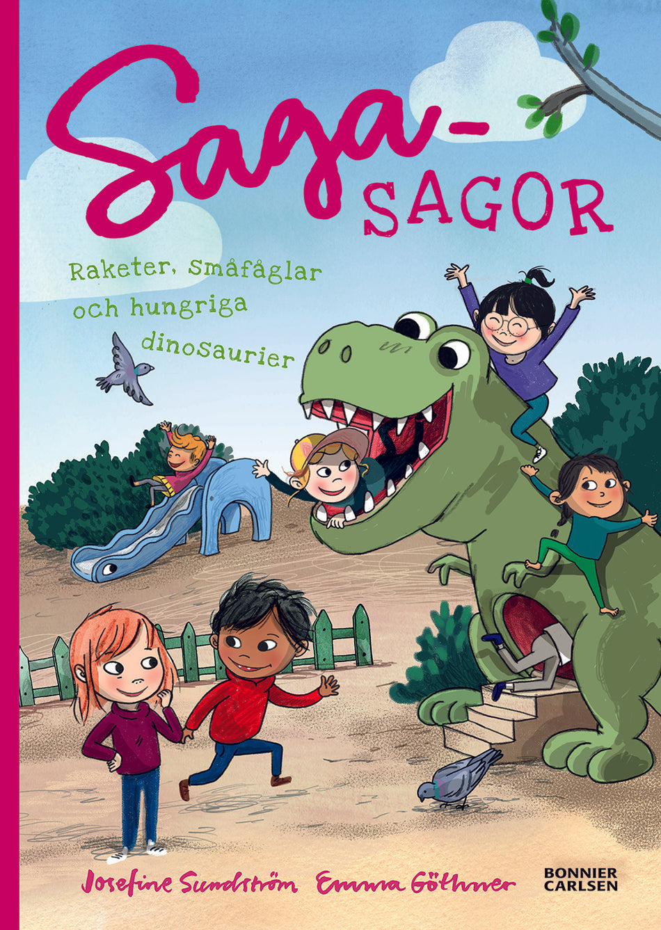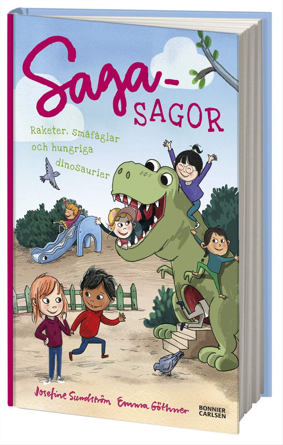 Nu är hon här igen – Saga Louisa Larsson!Josefine Sundström och illustratören Emma Göthner berättar i fem fristående kapitel om Saga fem år som bor tillsammans med sin familj i ett av ”Gladhusen” på Solrosvägen.Den här gången kämpar Saga för att hålla sig vaken på det sena nyårsfirandet tillsammans med släkten och storkusinerna, hon övervinner rädslan för gigantiska dinosaurier i en Dinopark, och en dag flyttar det in en ny familj i grannhuset. Saga står och spanar i fönstret när flyttgubbarna bär in en fågelbur i huset. Tänk, Saga som älskar djur!Inkännande och med ett genuint barnperspektiv beskrivs små men livsviktiga ögonblick i en fem/sex-årings vardag. Emma Göthners många pigga och inkännande illustrationer gör Sagasagor till en perfekt övergång från att läsa bilderbok till att börja läsa textböcker.Sagasagorna finns även som ljudböcker, i barnradion och som tv-filmer.Läs fler kapitelböcker om Saga:Sagasagor: studsmatta, simskola och en borttappad Tigertass, 2016. (Boken tilldelades priset: Din bok - Vårt val, Svenska Bokhandelsmedhjälpareföreningens årliga pris för bästa barnbok 2016.)Sagasagor: syskonsjuka, kämpaglöd och en envis framtand, 2017Sagasagor: fiffiga kroppen och finurliga knoppen, 2017 (i samarbete med Kronprinsessparets stiftelse Generation Pep)Sagasagor: bananbus, finskor och en superjobbig superhjälte, 2018Sagasagor: ballonglängtan, kurragömma och två tomtar i diket, 2019Bilderböcker om Saga:Den underliga julklappen, 2020Sagasagor ABC (en ABC-bok) 2021Läs tillsammans-böcker om Saga och kompisen Samir:Branden, 2020Stölden, 2020Såret, 2021