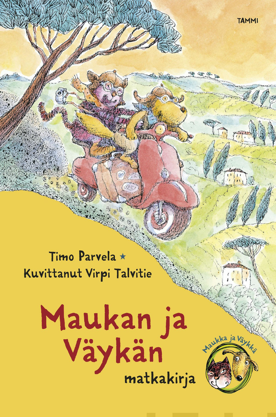 Maukka uhkailee joka syksy lähtevänsä etelään, mutta tällä kertaa matkasta tulee totta. Kissa aivan tärisee jännityksestä ja innosta. Mukaansa se kaappaa ystävänsä Väykän, joka jo lähtiessä huolehtii: tuliko ovi lukkoon, jäivätkö valot päälle, entä takan pelti... Maukka onnistuu menomatkalla tuhlaamaan yhteisen matkakassan kameraan, joten perillä hyvät neuvot ovat kalliit. Kuumassa ja okrankeltaisessa Italiassa molemmista matkalaisista paljastuu uusia piirteitä. Väykkä ihastuu kovasti muhevan mullan maahan, jossa viljely on helppoa. Viikunoita, persikoita, sitruunoita... nami! Ja kas kummaa, käytännöllinen ja avulias koira on myös se, jonka on helppo ystävystyä paikallisten kanssa. Maukan mieleen sen sijaan alkaa hiipiä koti-ikävä... Kirja on kuin hauska tilkkutäkki tekstikatkelmia ja kuvia. Virpi Talvitien väri-ilotteleva kuvitus on tällä kertaa erityisen runsasta.