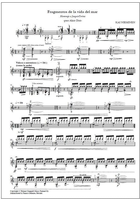 Downloadable PDF edition. Fragmentos de la vida del mar - Homenaje a Joaquin Turina has a dark, brooding quality, the use of tremolo often with a ponticello colour creating a mystery and unease, perhaps even depicting a storm on the horizon. The piece can be coupled with "Hommage a Andres Segovia... Lue lisää