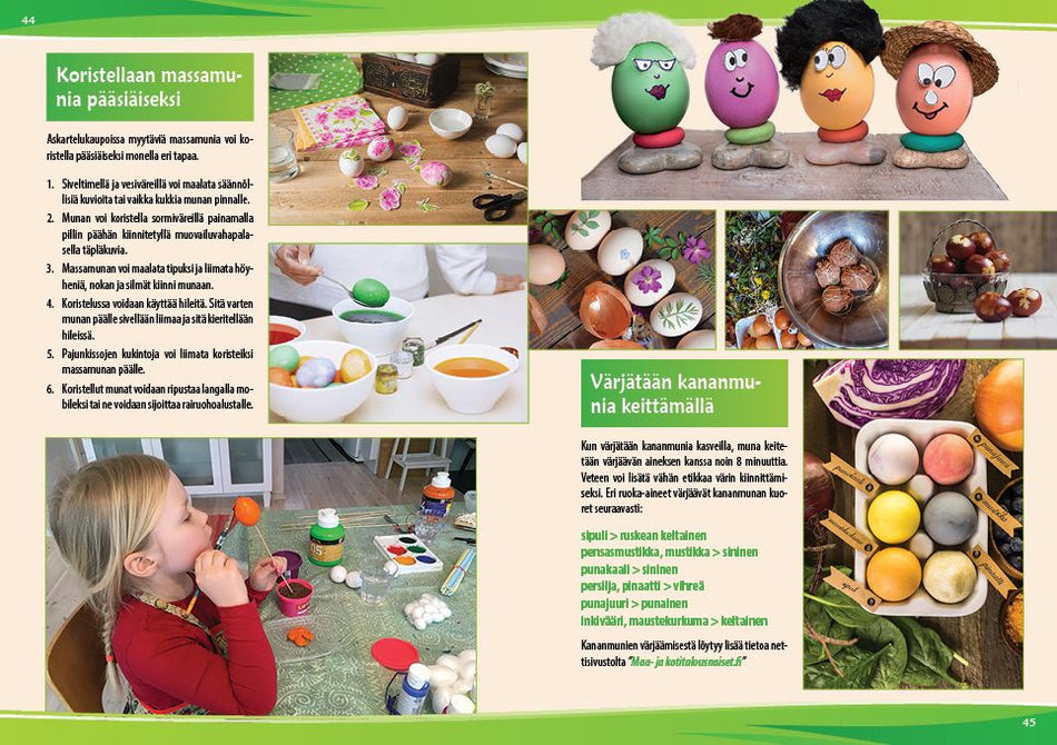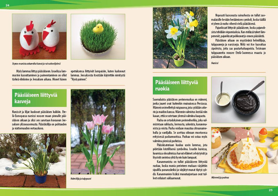 Pääsiäinen ja vappu ovat kevään juhlia. Molempiin liittyy perinteisiä tapoja ja ruokia. Istutetaan rairuohoa ja tehdään pääsiäiskoristeita. Maalataan munia ja tehdään virpomisvitsa. Vapuksi voidaan valmistaa vappuviuhka ja vappuhattu. Kokeillaan sormivirkkausta, jolla voi esimerkiksi päällystää kynätölkin. Erikokoisista tupsuista voidaan tehdä eläimiä ja koristeita, vaikka avainperiksi tai reppuun. Tehdään huovasta värikkäitä helmiä. Parittomasta sukasta voidaan valmistaa pupu ja villasormikkaasta pehmoeläin.