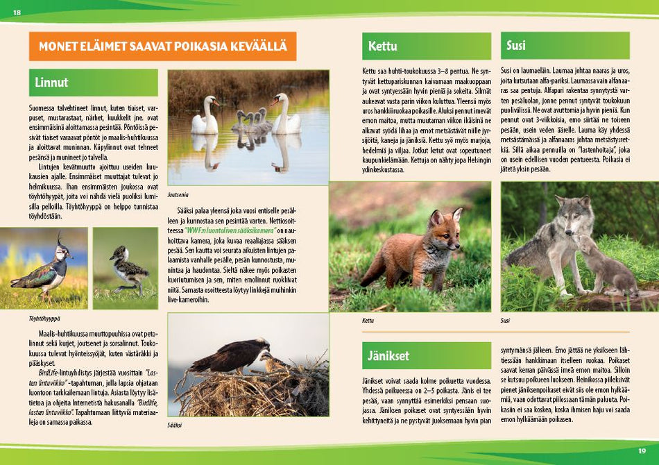 Kevät on luonnossa heräämisen ja kasvun aikaa. Nähtävää ja tutkittavaa löytyy niin metsistä, niityiltä kuin rannoiltakin. Kevään heräämistä ja kasvien kasvua voi seurata kaupungin puistossa tai omalla pihallaan. Tehdään lapsen kanssa kevään merkkien ”bongauspassi”, johon voidaan merkitä havaitut uudet kukat, linnut ja hyönteiset. Valokuvataan kevättä luonnossa. Voidaan käydä lintutornissa kiikaroimassa muuttolintuja ja sammakkolammella etsimässä nuijapäitä. Pohditaan, miten linnut osaavat lentää Afrikasta Suomeen? Mikä herättää sitruunaperhosen lentoon?