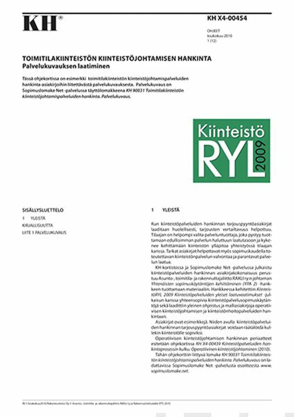 Ohjekortissa on esimerkki toimitilakiinteistön kiinteistöjohtamispalveluiden hankinta-asiakirjoihin liitettävästä palvelukuvauksesta. Ohjekorttiin liittyvä täyttölomake, KH 90031 Toimitilakiinteistön kiinteistöjohtamispalveluiden hankinta. Palvelukuvaus (2010), on ladattavissa maksullisesta Sopimuslomake Net -palvelusta osoitteesta www.sopimuslomake.net.