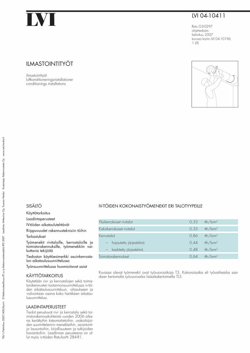 SISÄLTÖ: 1. Käyttötarkoitus, 2. Laadintaperusteet, 3. IV-töiden aikataulutehtävät (IV-töiden aikataulunimike, sen sisältö ja suunnittelutaso), 4. Riippuvuudet (IV-työvaiheen edeltävät työvaiheet), 5. Tarkastukset (tarkastusten, toimintakokeiden, mittausten ja koekäytön suorittaja sekä suoritusaika), 6. Työmenekit; IV-töiden keskiarvotyömenekit rivitaloissa, kerrostaloissa ja toimistorakennuksissa, IV-töiden työmenekit jaettuna bruttoneliöille ko. rakennuksille sekä IV-töiden huoneistokohtaiset työmenekit aikataulunimikkeittäin ko. rakennuksille, 7. Tiedoston käyttöesimerkki asuinkerrostalon aikataulusuunnittelussa, 8. Työnsuunnittelussa huomioitavat asiat.