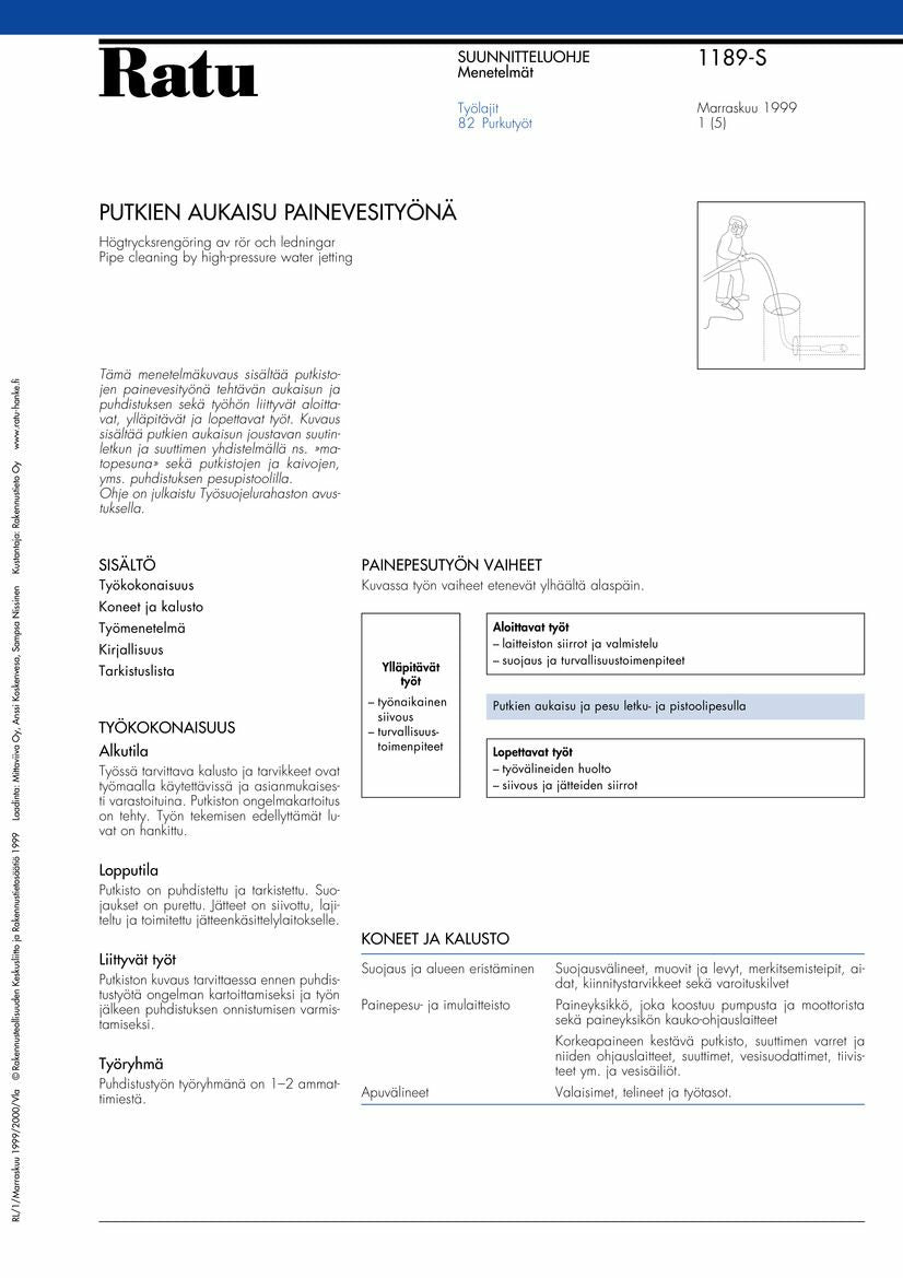 Tämä menetelmäkuvaus sisältää putkistojen painevesityönä tehtävän aukaisun ja pudistuksen sekä työhön liittyvät aloittavat, ylläpitävät ja lopettavat työt. Kuvaus sisältää putkien aukaisun joustavan suutinletkun ja suuttimen yhdistelmällä ns. matopesuna sekä putkistojen ja kaivojen, yms. puhdistu... Lue lisää