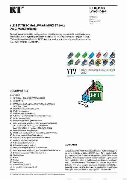 Tässä ohjeessa käsitellään mallipohjaisen määrälaskennan menetelmiä, määrälaskennan vaatimuksia malleille ja mallipohjaiseen määrälaskentaan liittyviä tyypillisiä ongelmakohtia. ”Yleiset tietomallivaatimukset 2012” kattavat uudis- ja korjaus rakentamiskohteet sekä rakennusten käytön ja ylläpidon.