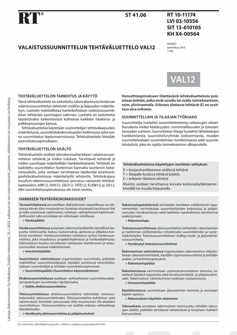- Avainsanat rakennushankkeet; suunnittelu; talotekniikka; hankesuunnittelu; rakennussuunnittelu; talonrakennushankkeet; suunnittelusopimukset; valaistus; valaistussuunnittelu; tehtäväluettelot; konsulttisopimukset; RT; sähkösuunnittelu; VAL12; 11174; 1011174; RT-11174; RT10-11174; RT1011174; RT11174