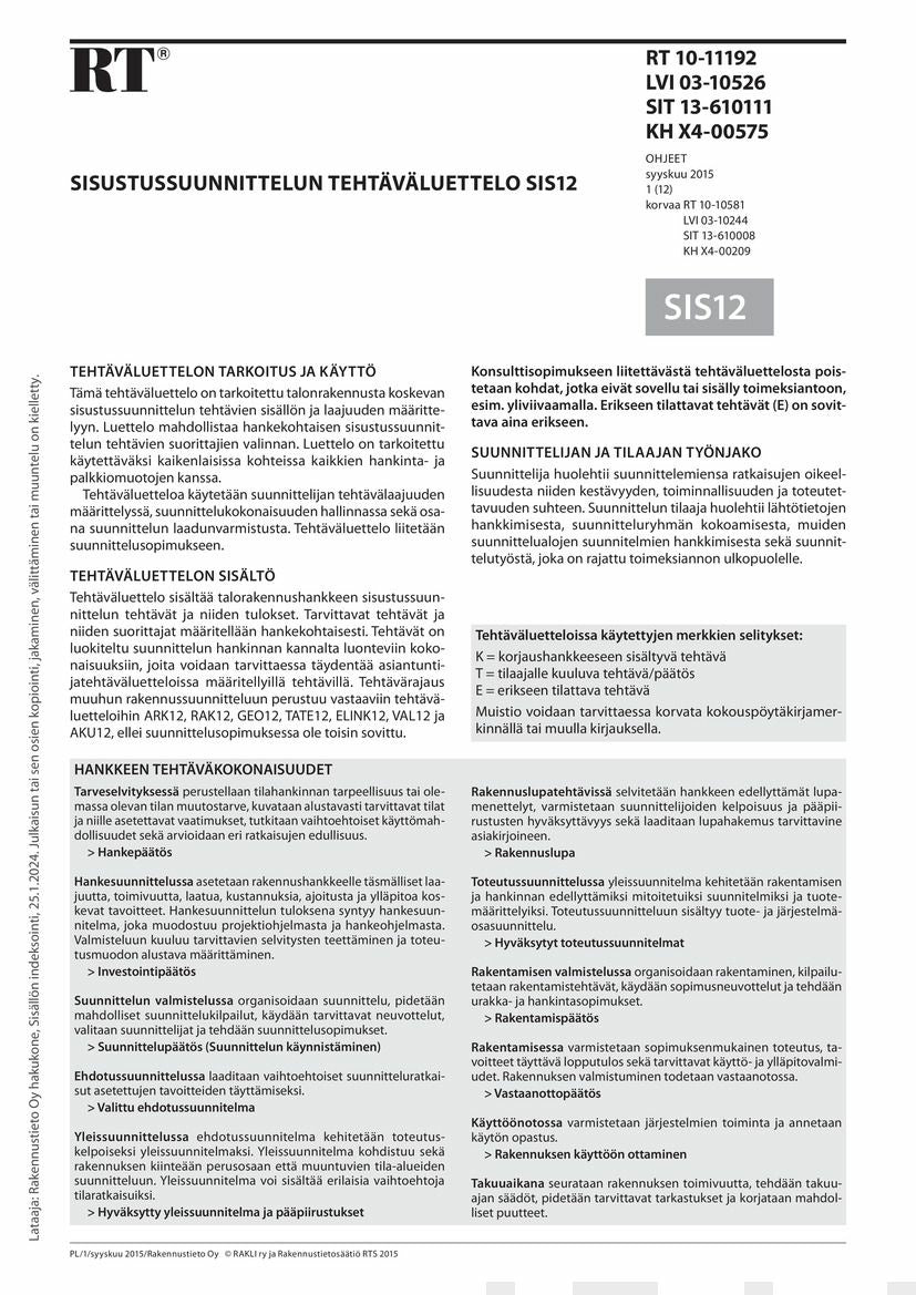 RT 10-11192, Sisustussuunnittelun tehtäväluettelo SIS12