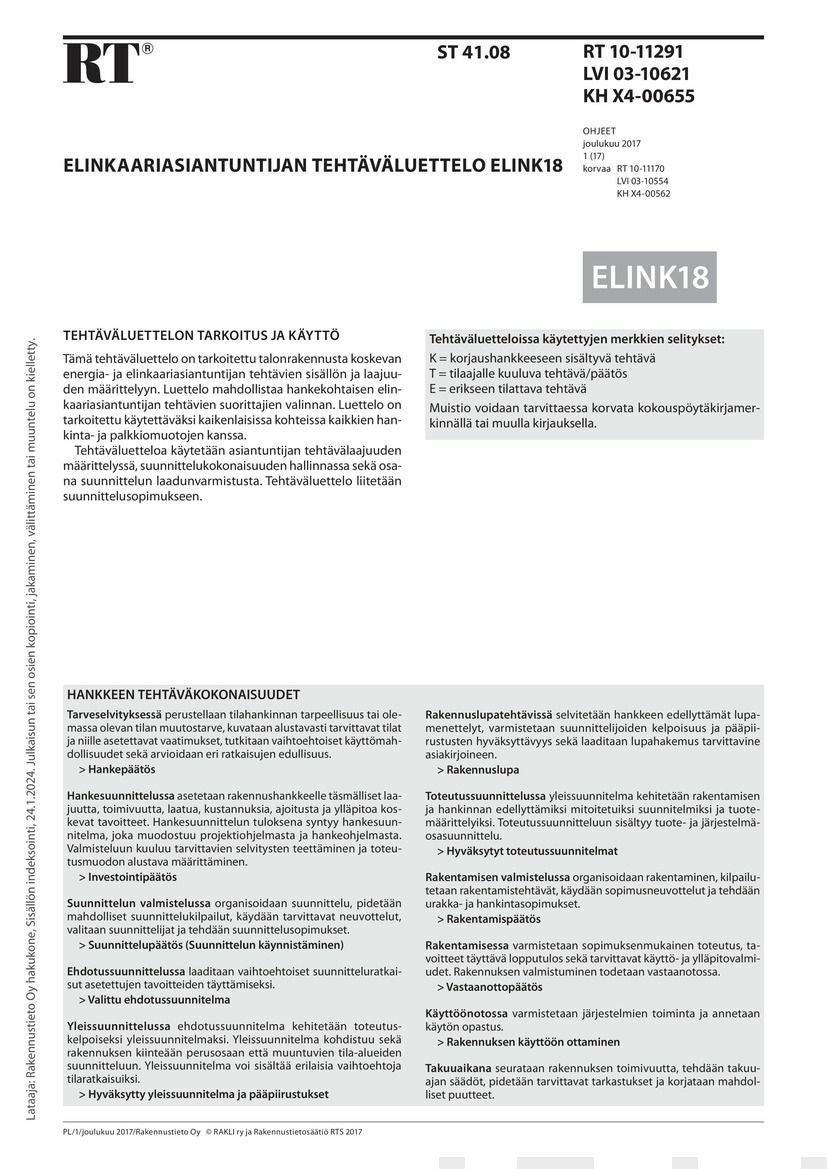 RT 10-11291, Elinkaariasiantuntijan tehtäväluettelo ELINK18