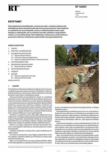 Tässä ohjekortissa käsitellään jäte- ja hulevesien öljyn- ja hiekanerottimia sekä keittiöiden ja elintarviketeollisuuden jätevesien rasvanerottimia. Tämä ohjekortti on tarkoitettu LVI-suunnittelijoille, mutta se sisältää hyödyllistä tietoa myös tilaajille ja urakoitsijoille. LVI-suunnittelun kannalta esitetään eri järjestelmien mitoitus- ja suunnittelutietoja. Tämä ohjekortti ei sellaisenaan sovellu teollisuusprosessien erottimien mitoitukseen, joka tehdään aina tapauskohtaisesti.