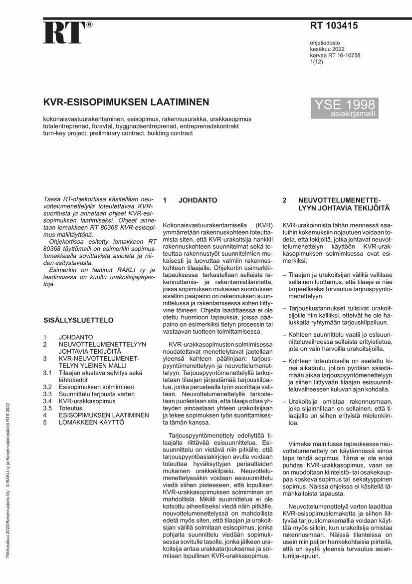 RT 103415, KVR-esisopimuksen laatiminen. (YSE 1998 asiakirjamalli)