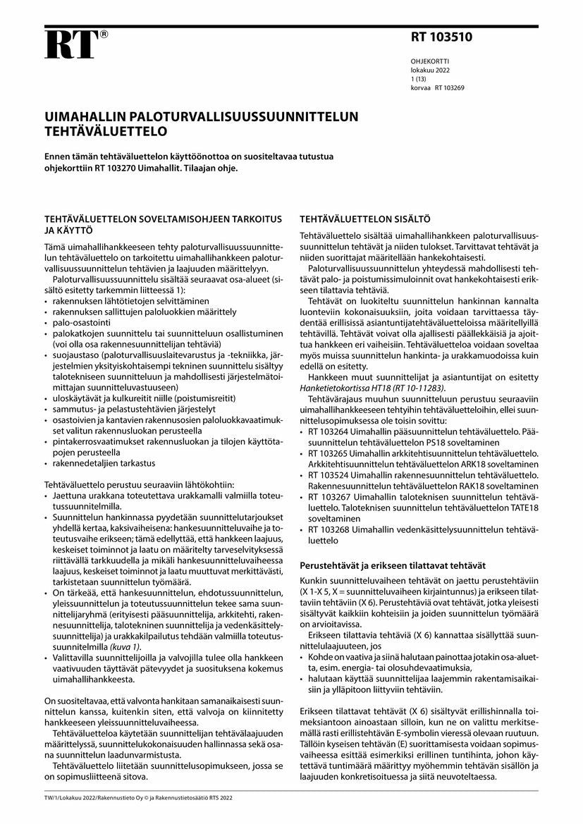 Tämä tehtäväluettelo on päivitys RT 103269 Uimahallin paloturvallisuussuunnittelun tehtäväluetteloon. Muutokset päivityksessä ovat pieniä.
