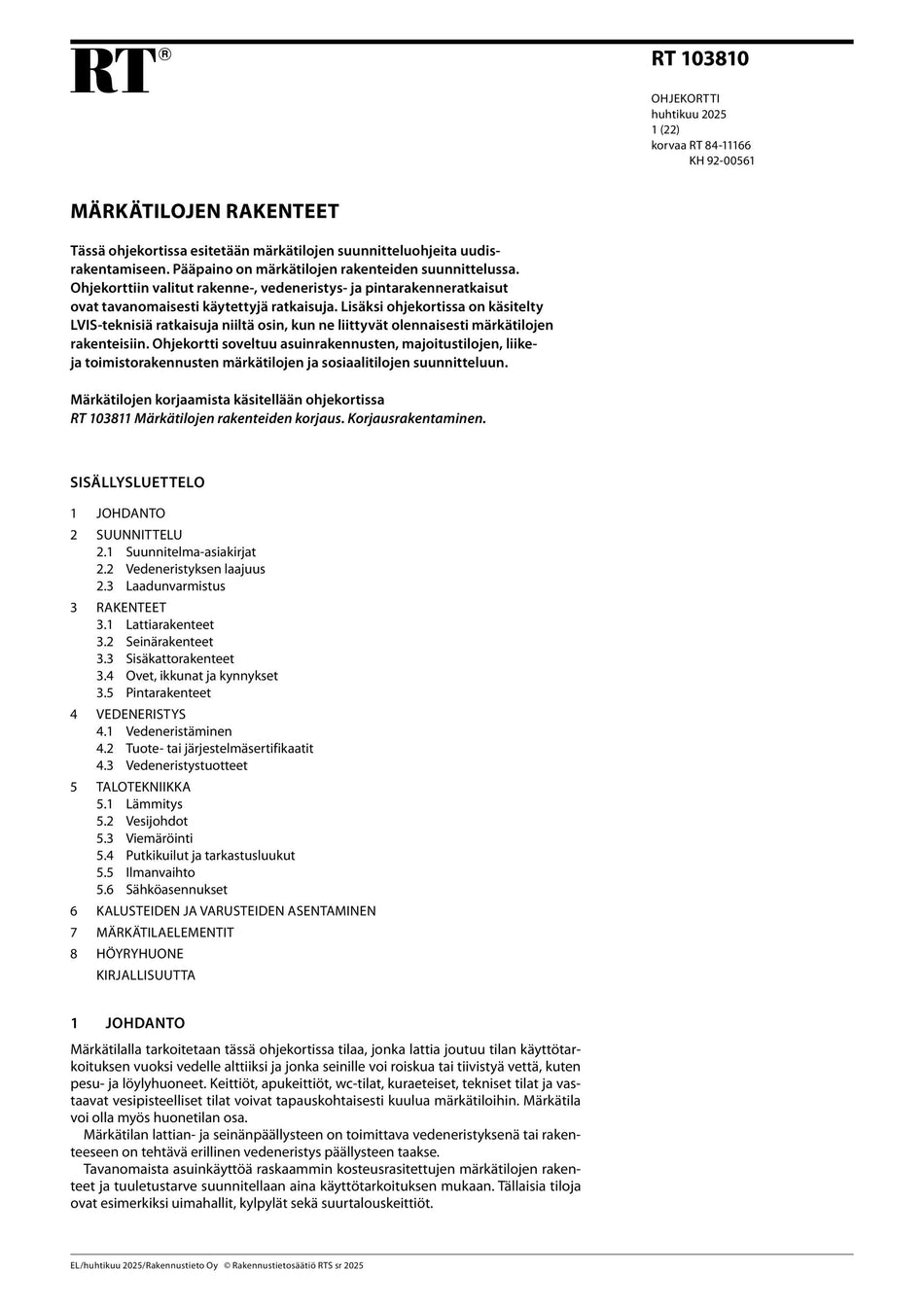 Ohjekortissa esitetään märkätilojen suunnitteluohjeita uudisrakentamiseen. Pääpaino on märkätilojen rakenteiden suunnittelussa. Ohjekorttiin valitut rakenne-, vedeneristys- ja pintarakenneratkaisut ovat tavanomaisesti käytettyjä ratkaisuja. Lisäksi ohjekortissa on käsitelty LVIS-teknisiä ratkaisu... Lue lisää