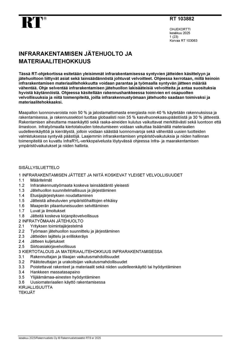 RT 103882, Infrarakentamisen jätehuolto ja materiaalitehokkuus