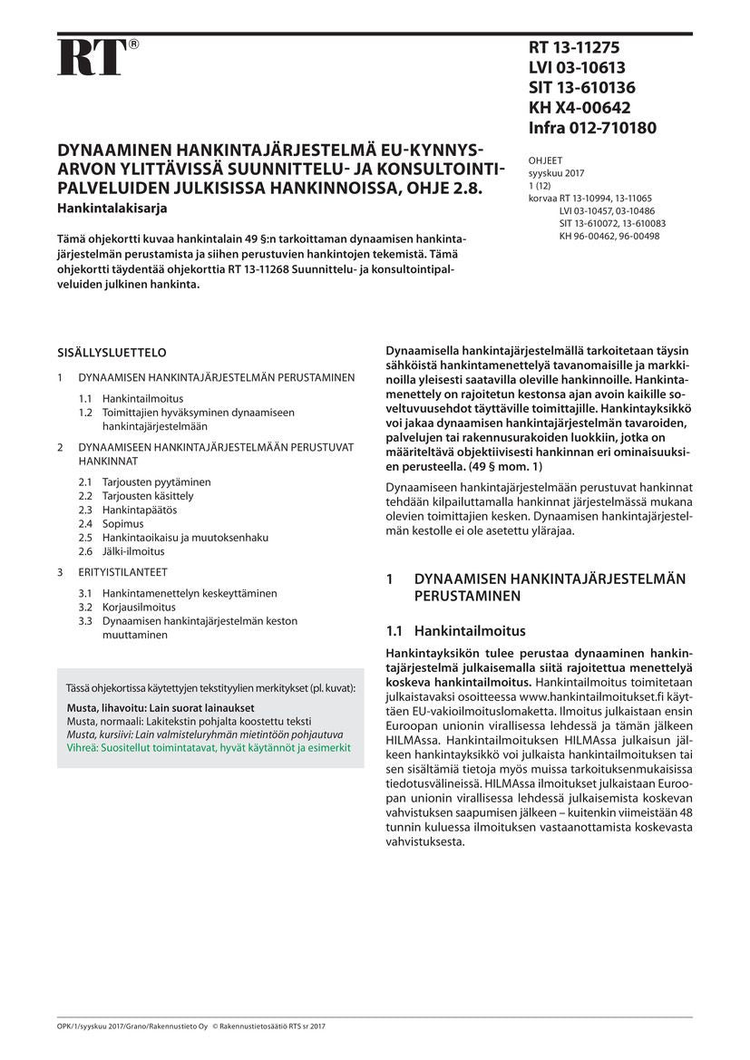 RT 13-11275, Dynaaminen hankintajärjestelmä EU-kynnysarvon ylittävissä suunnittelu- ja konsultointipalveluiden julkisissa hankinnoissa, ohje 2.8. Hankintalakisarja