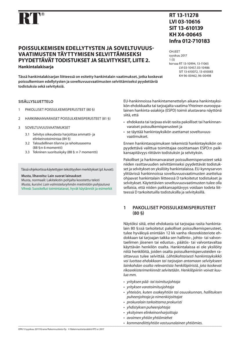 RT 13-11278, Poissulkemisen edellytysten ja soveltuvuusvaatimusten täyttymisen selvittämiseksi pyydettävät todistukset ja selvitykset, liite 2. Hankintalakisarja
