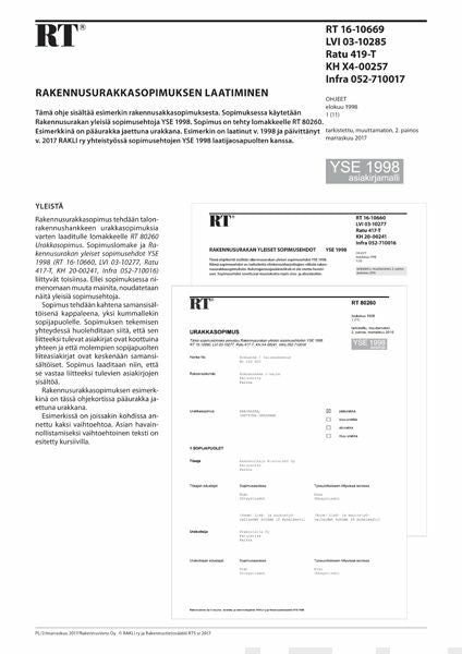Tämä täyttömalli sisältää esimerkin rakennusurakkasopimuksesta. Sopimuksessa käytetään Rakennusurakan yleisiä sopimusehtoja YSE 1998 RT 16-10660, (LVI 03-10277, KH-X4-00241, Infra 052-710016). Sopimus on tehty lomakkeelle RT 80260 Urakkasopimus, YSE 1998 asiakirja. Esimerkkinä on pääurakka jaettuna urakkana. Esimerkin on laatinut v. 1998 ja päivittänyt v. 2017 RAKLI ry yhteistyössä sopimusehtojen YSE 1998 laatijaosapuolten kanssa.