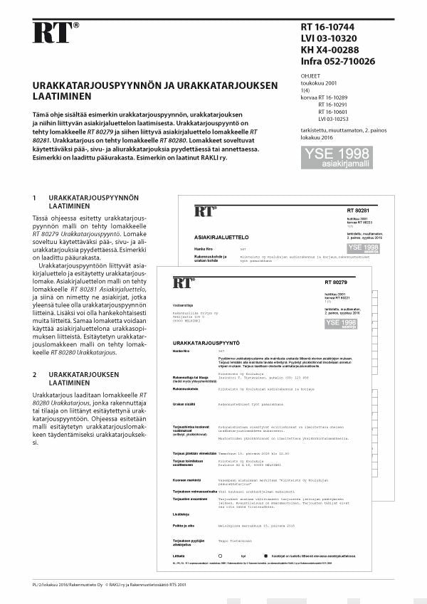 RT 16-10744, Urakkatarjouspyynnön ja urakkatarjouksen laatiminen (YSE 1998 asiakirjamalli)