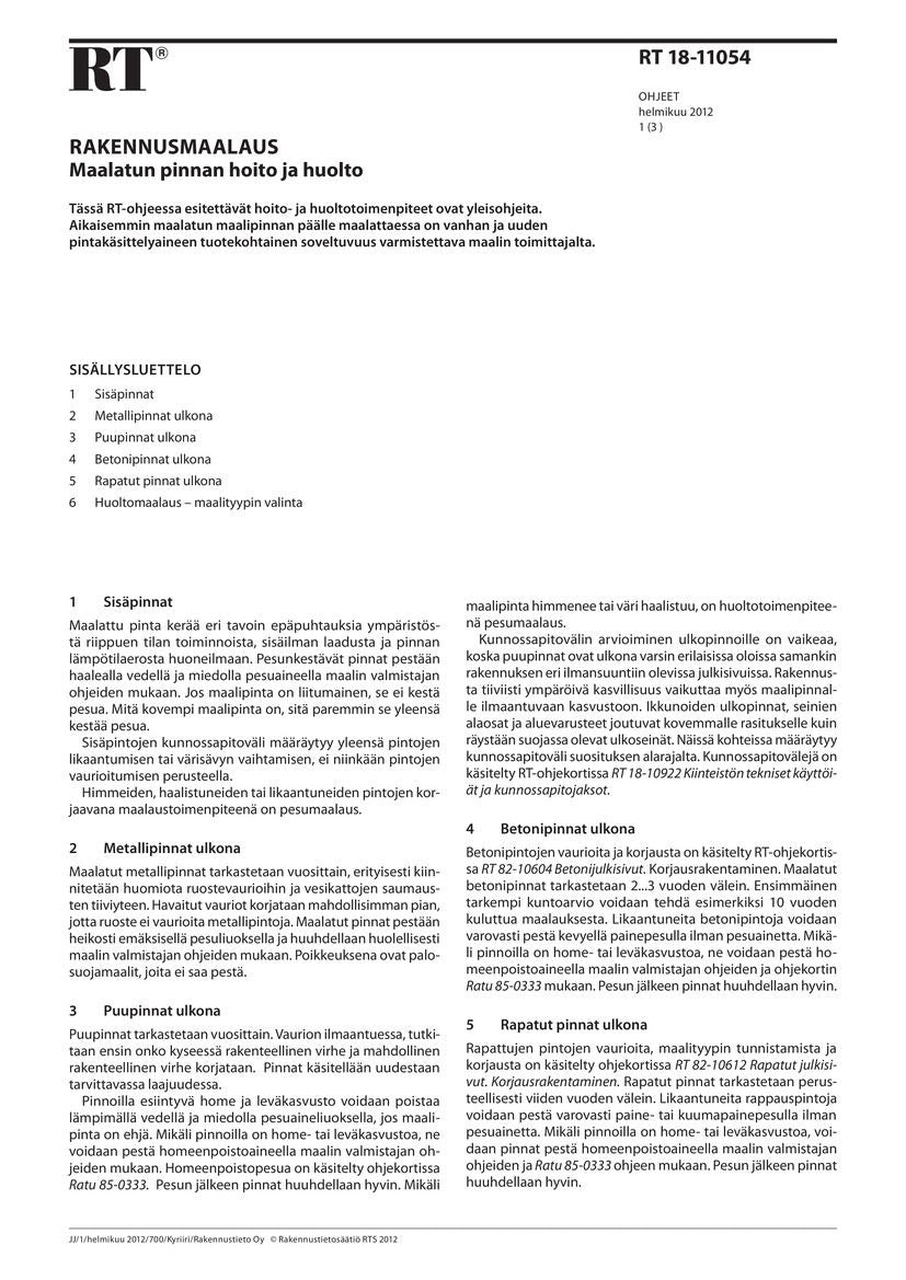 RT-ohjeessa esitettävät hoito- ja huoltotoimenpiteet ovat yleisohjeita. Aikaisemmin maalatun maalipinnan päälle maalattaessa on vanhan ja uuden pintakäsittelyaineen tuotekohtainen soveltuvuus varmistettava maalin toimittajalta.