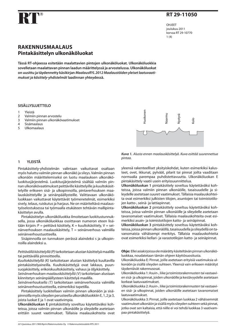 - Avainsanat julkisivumaalaus; maalaus; maalipinnat; pintakäsittely; pintatyöt; maalaustyö; rakennusmaalaus; julkisivut; ulkoseinät; seinät; sisäpinnat; sisäseinät; seinäpinnat; laatuvaatimukset; laatuluokat; ulkonäkövaatimukset; kuultokäsittely; ulkomaalaus; ulkonäköluokat