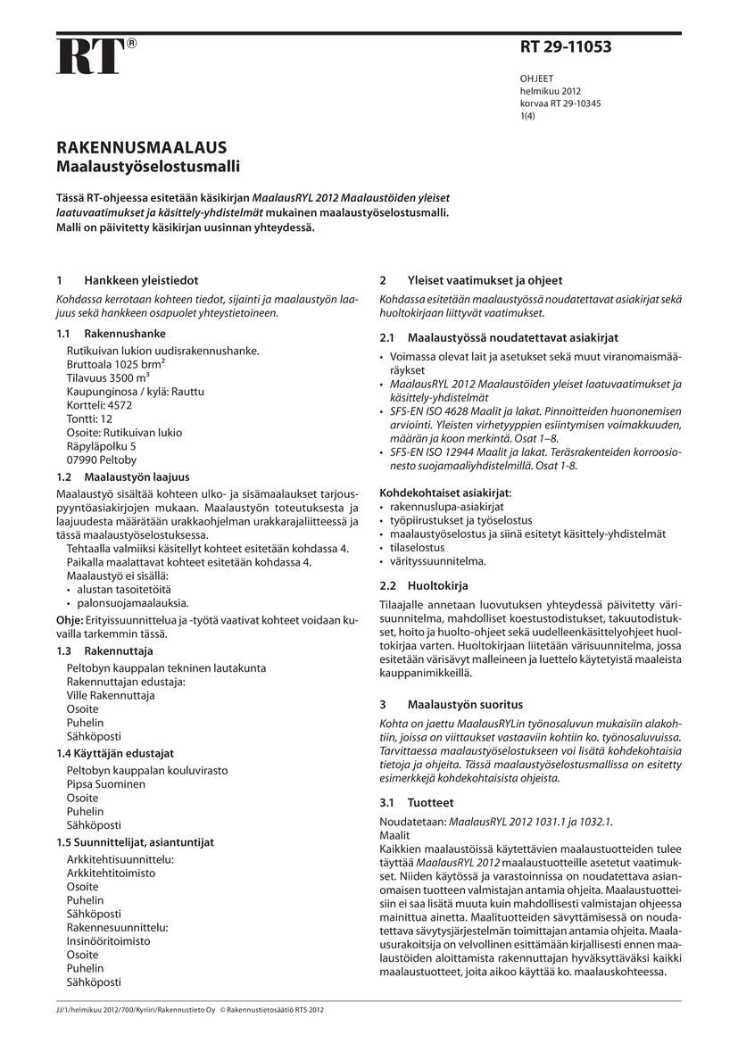 RT 29-11053, Rakennusmaalaus. Maalaustyöselostusmalli