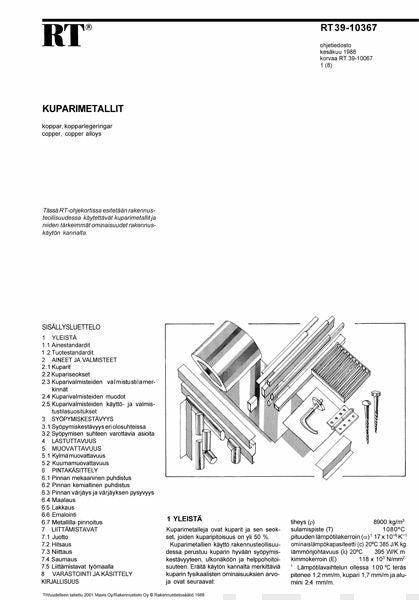 RT-ohjeessa esitetään rakennusteollisuudessa käytettävät kuparimetallit ja niiden tärkeimmät ominaisuudet rakennuskäytön kannalta. Ohjeessa tarkastellaan mm. kuparimetallien syöpymiskestävyyttä, lastuttavuutta, muovattavuutta, pintakäsittelyjä sekä liittämistapoja.
