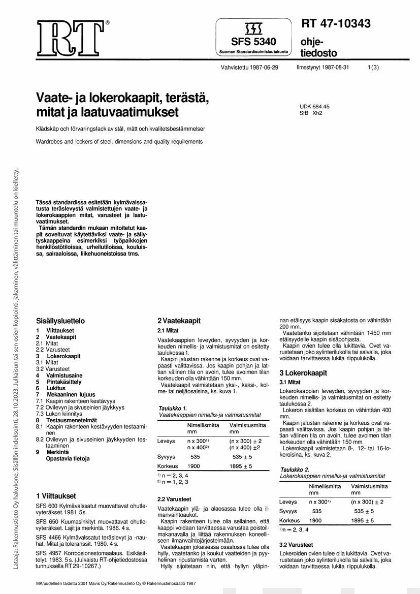 RT 47-10343, SFS 5340, Vaate- ja lokerokaapit, terästä, mitat ja laatuvaatimukset