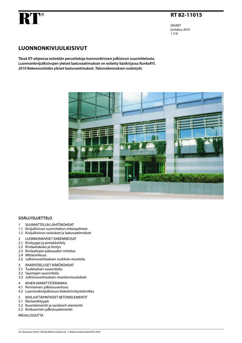 - Avainsanat julkisivut; ulkoseinät; seinät; laatuvaatimukset; seinärakenteet; julkisivuverhous; ulkoseinäverhous; ulkoverhous; julkisivuelementit; saumat; saumaus; julkisivurakenteet; ulkoseinärakenteet; luonnonkiviverhous; tuuletus; luonnonkivilaatat; kivilaatat; luonnonkivilevyt; pihalaatat; kivirakenteet; luonnonkivirakenteet; ilmasto-ominaisuudet; ilmastorasitukset; kivijulkisivut; kuorielementit; luonnonkivikuorielementit; sandwich-elementit
