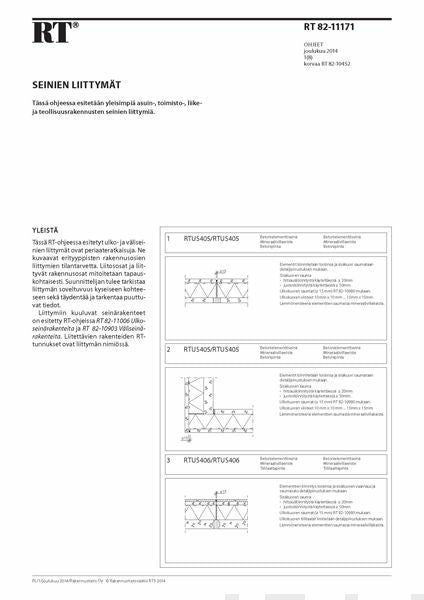 RT-ohjeessa esitetään yleisimpiä asuinrakennusten, toimistorakennusten, liikerakennusten ja teollisuusrakennusten seinien liittymiä. Ohjeessa esitetyt ulkoseinien ja väliseinien liittymät ovat periaateratkaisuja. Ne kuvaavat erityyppisten rakennusosien liittymien tilantarvetta. Esimerkkeinä mm. betonielementtiseinä, betoniseinä, teräsrankaseinä, puurunkoseinä, metallirakenteinen ulkoseinä, tiiliseinä, kevytsoraharkkoseinä ja puurakenteinen ulkoseinä.