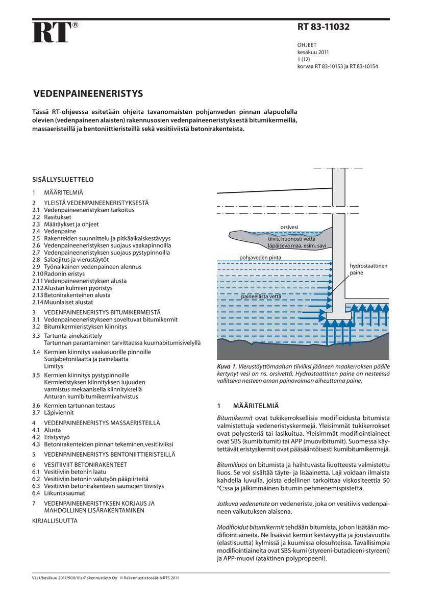 RT-ohjeessa esitetään ohjeita tavanomaisten pohjaveden pinnan alapuolella olevien vedenpaineen alaisten rakennusosien vedenpaineeneristyksestä bitumikermeillä, kaksikomponenttisilla epoksi-, polyuretaani- ja sementtipohjaisilla massaeristeillä ja bentoniittieristeillä. Vesitiiviiden betonirakenteiden suunnittelusta ja valutyöstä esitetään yleisohjeita.