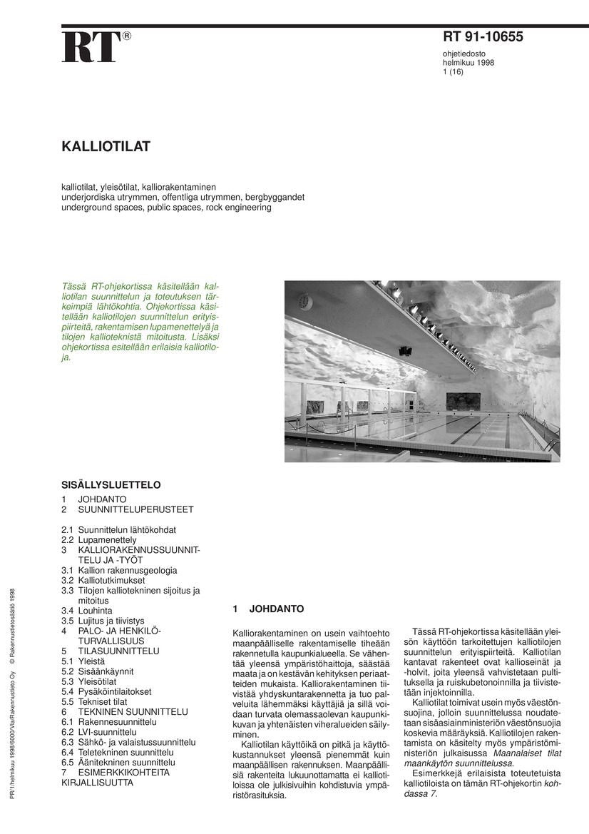 RT-ohjeessa käsitellään kalliotilan suunnittelun ja toteutuksen tärkeimpiä lähtökohtia. Ohjeessa käsitellään kalliotilojen suunnittelun erityispiirteitä, rakentamisen lupamenettelyä ja tilojen kallioteknistä mitoitusta. Lisäksi ohjeessa esitellään erilaisia kalliotiloja. Lue lisää