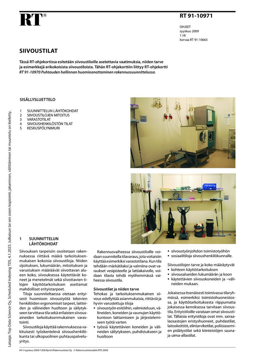 Siivouksen tarpeisiin osoitetaan rakennuksessa riittävä määrä tarkoituksenmukaisen kokoisia siivoustiloja. Niiden sijoituksen, lukumäärän, mitoituksen ja varustuksen määräävät siivottavan alueen koko, siivouksessa käytettävät koneet ja menetelmät sekä siivottavien tilojen käyttötarkoituksen asettamat mahdolliset erityistarpeet. Tiloja suunniteltaessa otetaan erityisesti huomioon siivoustyötä tekevien henkilöiden ergonomiset tarpeet, laitteiden ja välineiden huoltoon ja säilytykseen tarvittava tila sekä erilaisten siivousaineiden tarkoituksenmukainen varastointi.