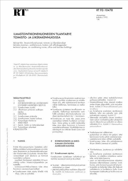 RT 92-10478, Ilmastointikonehuoneiden tilantarve toimisto- ja liikerakennuksissa E-kirja, suomi