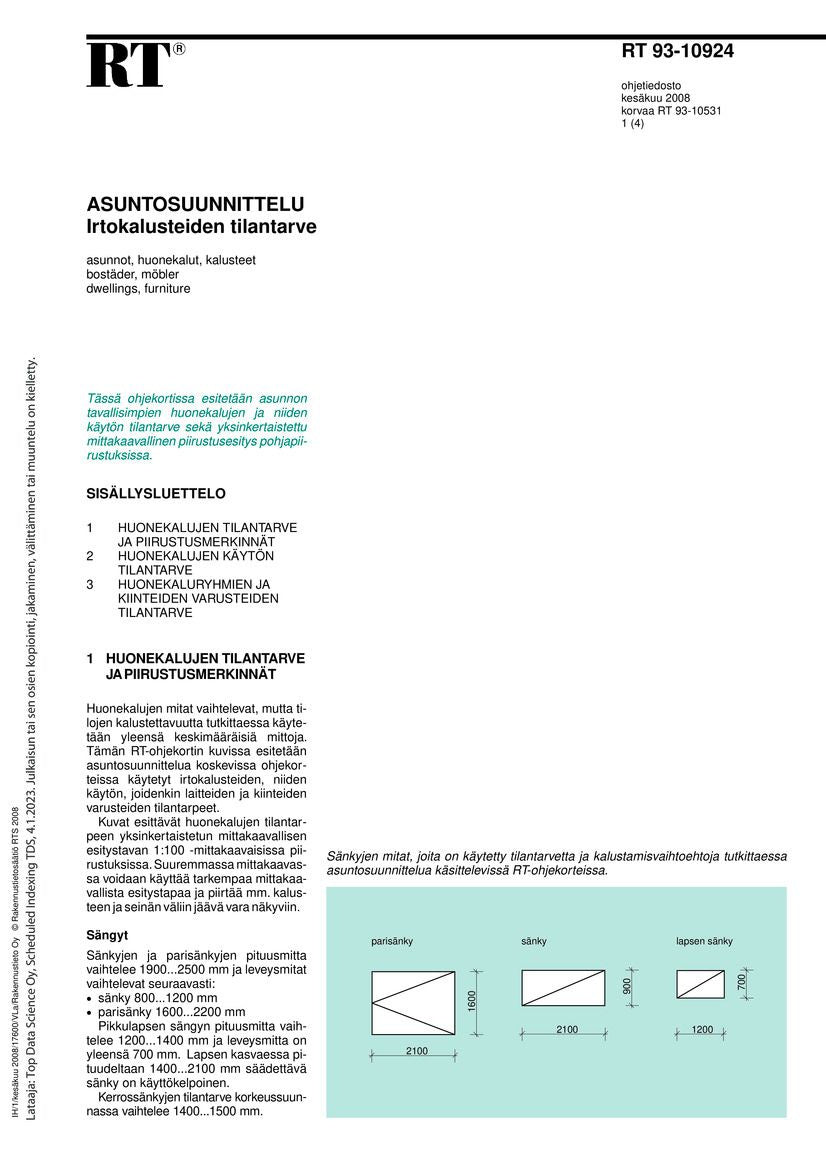 RT 93-10924, Asuntosuunnittelu. Irtokalusteiden tilantarve