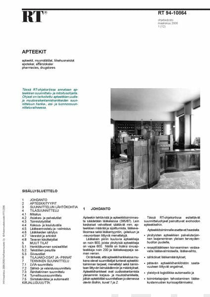RT-ohjeessa annetaan apteekkien suunnitteluohjeita ja mitoitusohjeita. Ohjeet on tarkoitettu apteekkien uudisrakentamishankkeiden ja muutosrakentamishankkeiden suunnitteluun hankesuunnitteluvaiheessa, esisuunnitteluvaiheessa ja luonnosasuunnitteluvaiheessa.