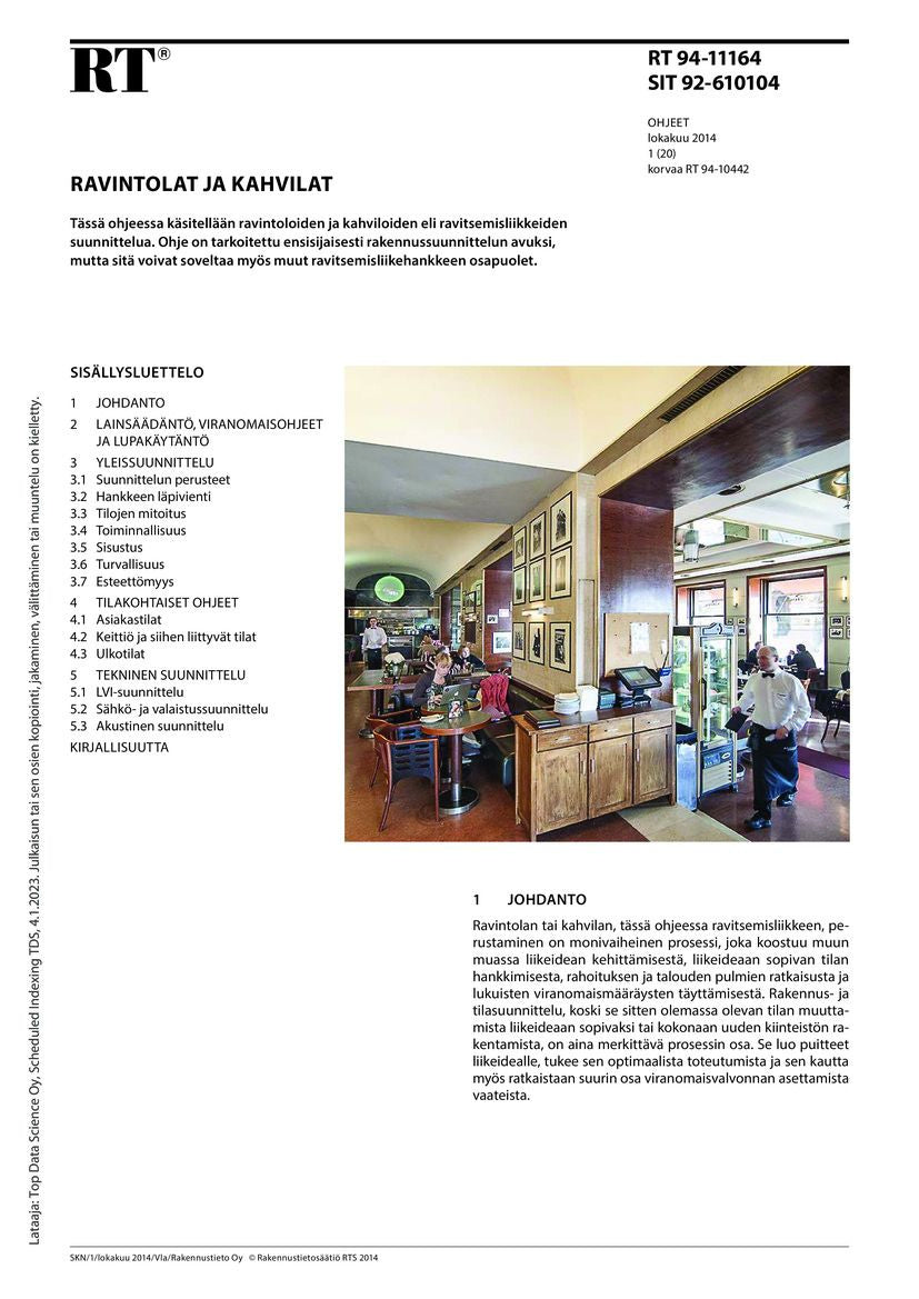 - Avainsanat ammattikeittiöt; kahvilat; ravintolat; hankesuunnittelu; esteettömyys; kalusteet; ilmanvaihto; luvat; LVI-suunnittelu; ruokalat; paloturvallisuus; valaistus; terassit; baarit; ravitsemisliikkeet; tupakointitilat; eteistilat; naulakkotilat; tuulikaapit; baaritiskit; ravintolakalusteet; ruoan jakelulinjastot; WC-tilat; pelastussuunnitelma; henkilöstöravintolat; henkilöstöruokalat; jakelukeittiöt; ravintolakeittiöt; ravitsemistilojen kalusteet; sisäänkäyntitilat; suurkeittiökalusteet; suurkeittiölaitteet; tanssilattiat; työpaikkaruokalat; suurkeittiöt; lounasravintolat; ravitsemistoiminta; tarjoilutiskit; ulkoterassit; ulkotarjoilualueet