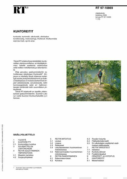 RT-ohjeessa käsitellään kuntoreittien yleissuunnittelua, eri käyttäjäryhmien reiteille asettamia vaatimuksia sekä reittien mitoittamista ja rakentamista. Ohje perustuu opetusministeriön rahoittamaan käsikirjaan Kuntoreitti 1. Kirjassa on käsitelty tässä ohjeessa esitettyjä asioita yksityiskohtais... Lue lisää