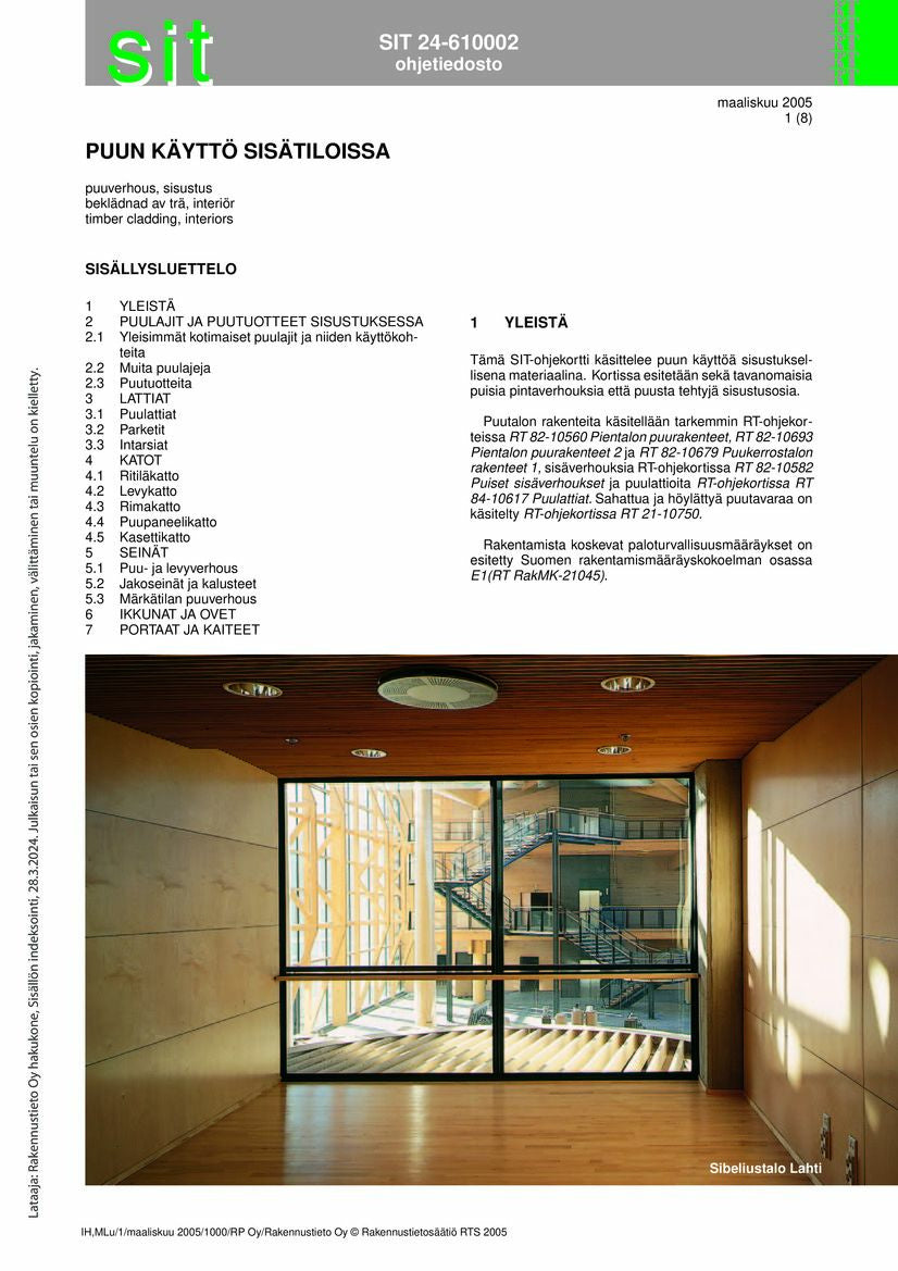 SISÄLLYSLUETTELO: 1. YLEISTÄ, 2. PUULAJIT JA PUUTUOTTEET SISUSTUKSESSA, 2.1 Yleisimmät kotimaiset puulajit ja niiden käyttökohteita, 2.2 Muita puulajeja, 2.3 Puutuotteita, 3. LATTIAT, 3.1 Puulattiat, 3.2 Parketit, 3.3 Intarsiat, 4. KATOT, 4.1 Ritiläkatto, 4.2 Levykatto, 4.3 Rimakatto, 4.4 Puupaneelikatto, 4.5 Kasettikatto, 5. SEINÄT, 5.1 Puu- ja levyverhous, 5.2 Jakoseinät ja kalusteet, 5.3 Märkätilan puuverhous, 6. IKKUNAT JA OVET, 7 PORTAAT JA KAITEET.